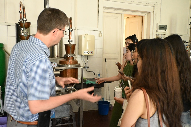 (图2 Szilárd Kun教授向夏令营学员演示Pálinka设备操作流程)