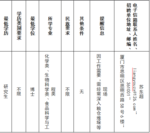 根据《厦门市事业单位补充工作人员暂行规定》,厦门市发展和改革委员会所属事业单位厦门市粮油质量监测和军粮供应中心决定采用简化招聘程序,招聘3名具有博士学历学位的事业单位编内工作人员。现将招聘简章公布如下: