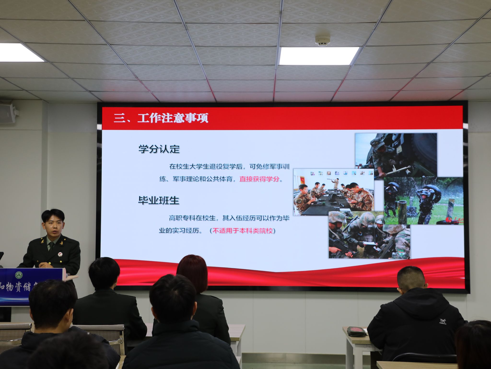 随后,优秀退役军人代表罗明详细解读了国家征兵政策。他从征兵的意义、征集对象、条件标准、报名流程、优待政策等方面进行了全面深入的讲解。同时,他还结合实际案例,生动地讲述了大学生在部队中的成长经历和发展机遇,让同学们对军旅生活有了更加直观的认识。