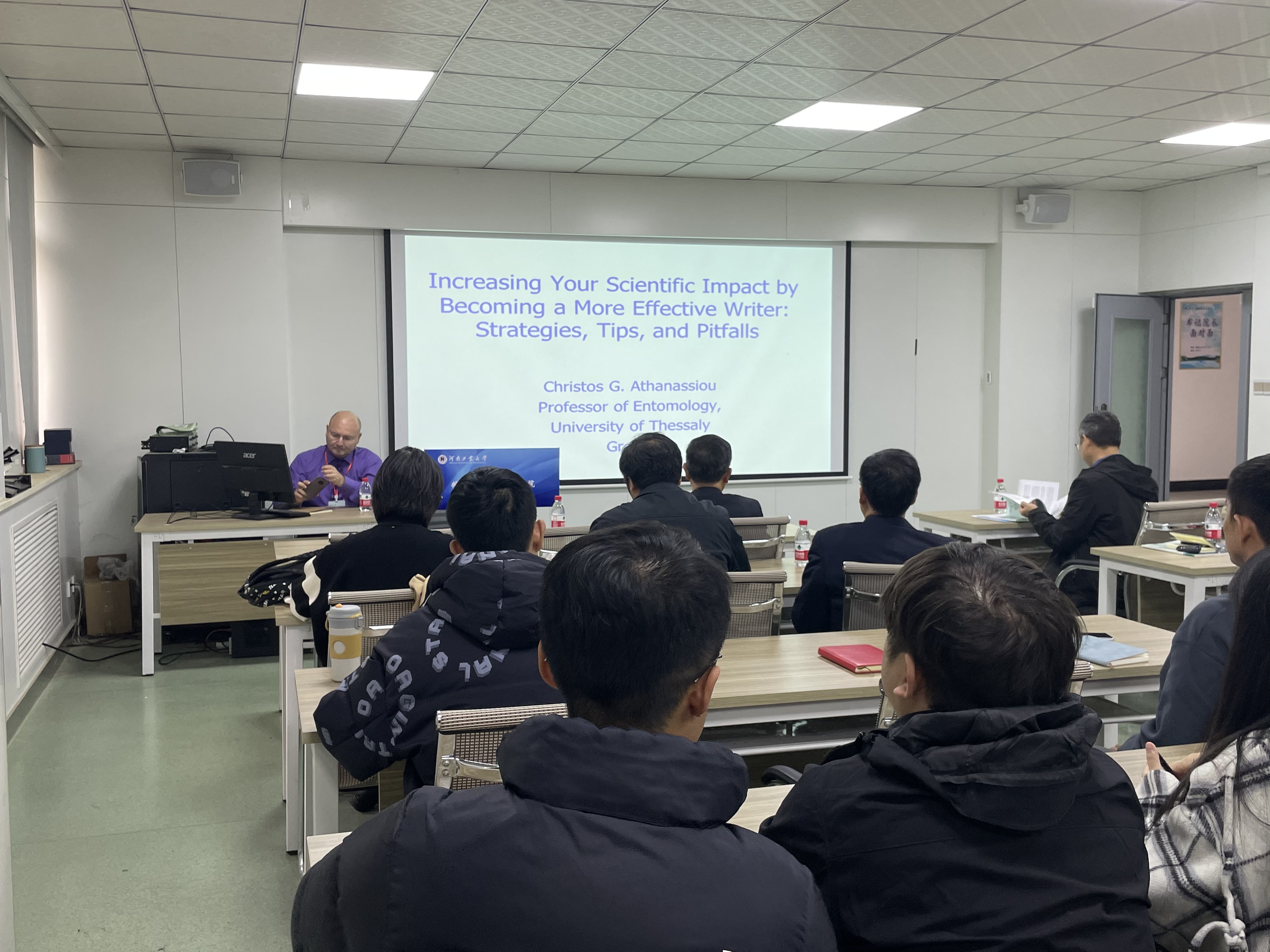Christos教授做了题为“Increasing Your Scientific Impact by Becoming a More Effective Writer: Strategies, Tips, and Pitfalls”的学术报告,他从论文研究背景描述、写作思路、审稿人关注点、论文接收时效等方面分享了关于科技论文写作的经验,并与师生进行了交流。翦福记教授围绕科研选题、科研实验开展、成果总结和呈现等方面与师生进行了充分交流。