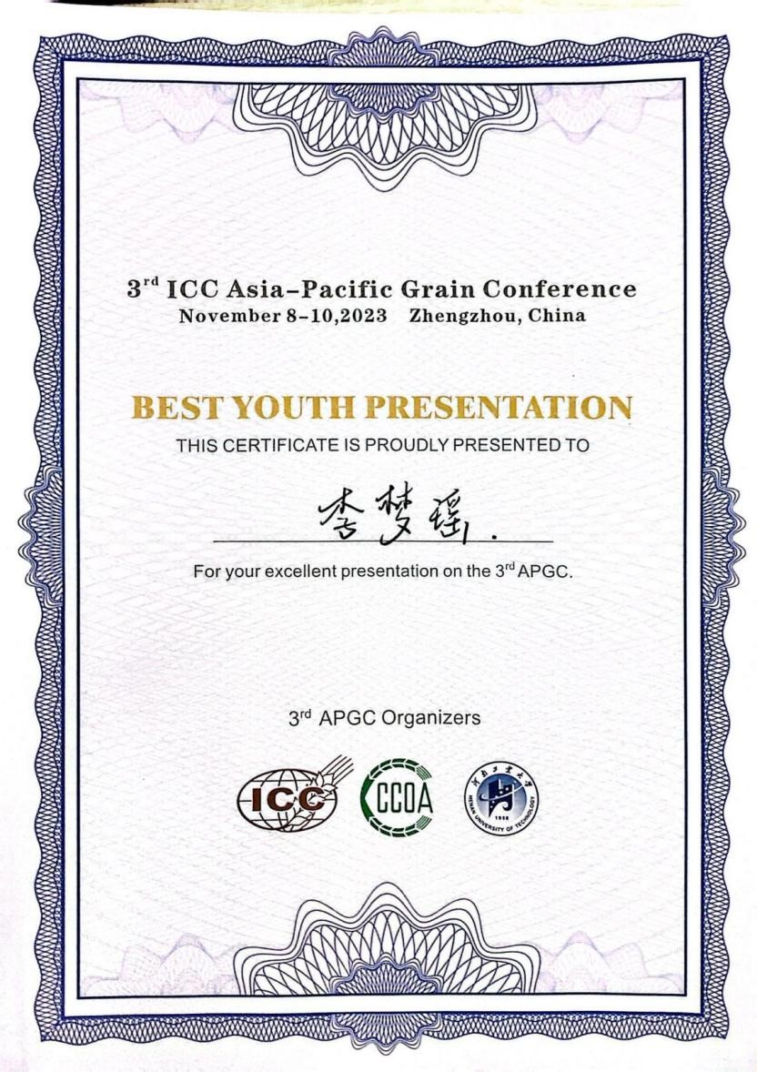 经评审,李梦瑶同学获评“BEST YOUTH PRESENTATION(最佳青年报告奖)”并受邀参加第三届ICC亚太区粮食科技大会颁奖仪式暨大会闭幕式。