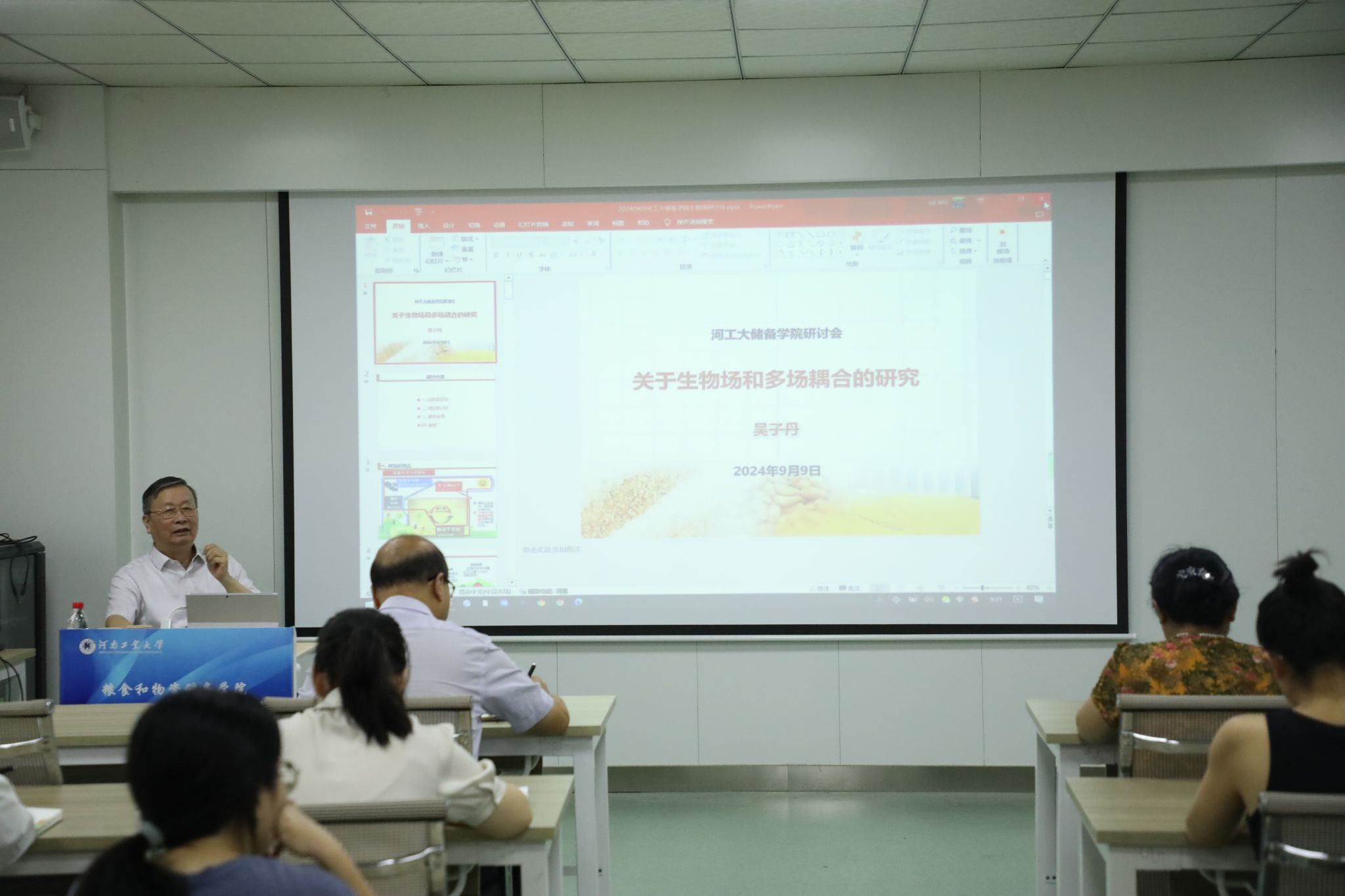 吴子丹研究员以其深厚的学术造诣和前瞻性的视野,引领大家深入探索了粮食储藏理论研究的最新边界与技术发展的蓬勃态势。并围绕“关于粮堆生物场和多场耦合的研究”的主题解读了生态场概念的提出背景、研究过程,对多场耦合理论的研究实践进行了深入分析,对未来发展方向提出了宏观思考。随后,与学院教师进行了充分而热烈的讨论,并鼓励大家将粮食储藏中的“技术问题”升华到“科学问题”。