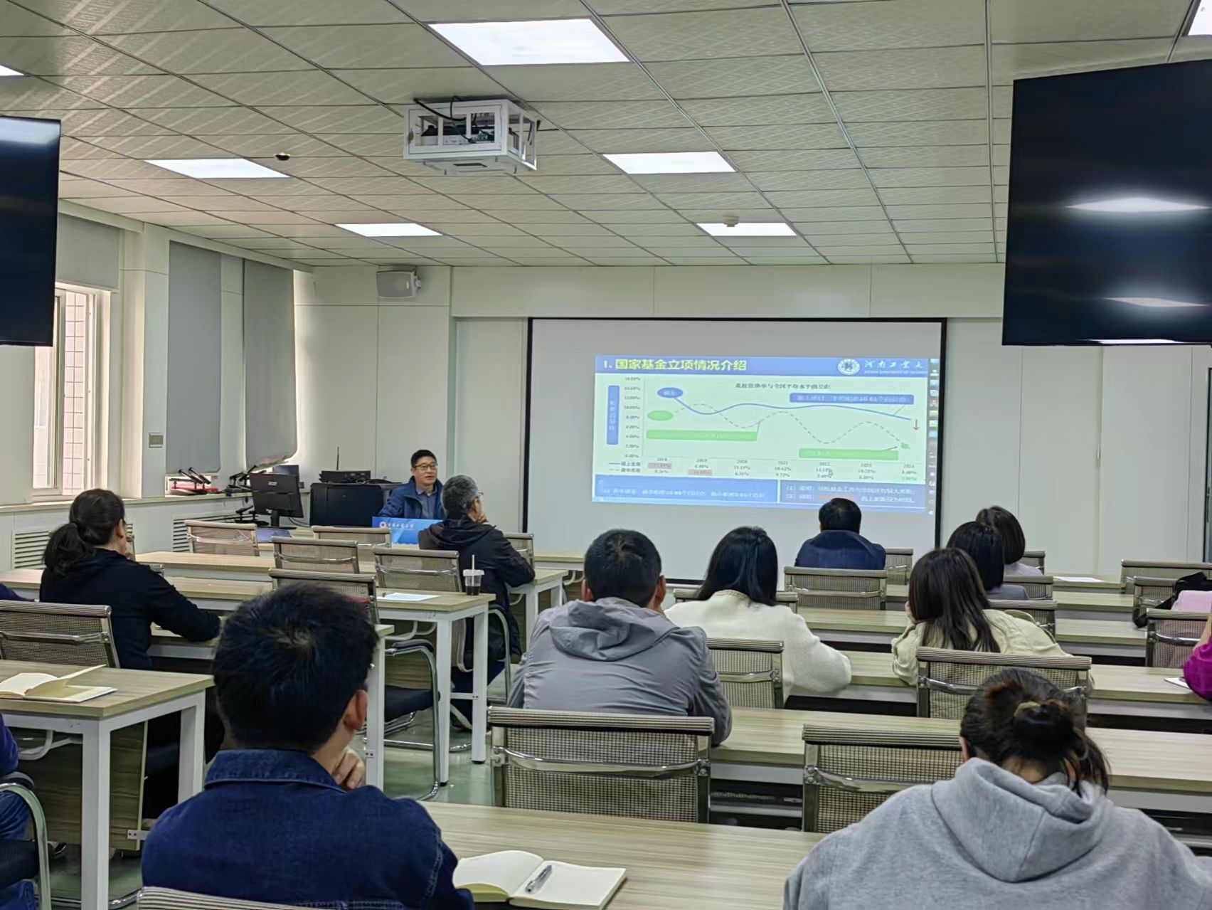 会议第一阶段,由党委书记代辉亚进行了动员讲话,他强调了基金工作对个人和学校发展的重要性,鼓励青年教师积极申报。随后由学术副院长陈亮通报了学校2024年度国家自然科学基金项目获批情况,从整体现状、近年获批情况、在豫高校对比分析、校内兄弟学院获批情况等方面详细剖析了学院国家自然科学基金现状,然后具体分析了当前形势、为什么要申请国家基金、学院2024年申报项目评审意见,并对2025年度学院国家自然科学基金申报工作进行了具体安排。