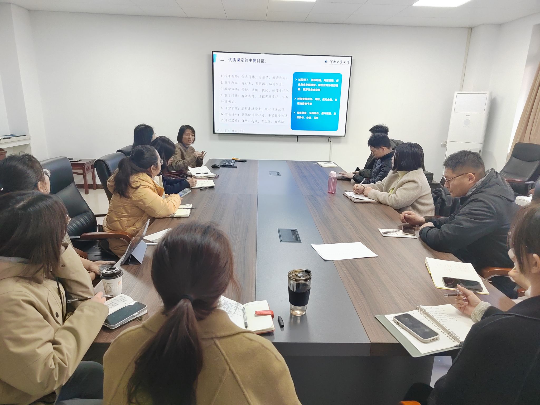 王争艳围绕如何打造优秀课堂教学为目标,从优秀课堂案例、优秀课堂的主要特征、课堂突出问题案例及“水课”的主要特征四部分内容展开培训,并列举了部分课堂优秀教师采取的教学新方法、教学设计、课堂管理、课程思政及新的信息技术等,希望青年教师多听多学多请教,根据个人课程特点,挖掘课程思政元素,制定适宜的教学方法。会后青年教师交流了在教学中的切身感受和遇到的困惑,针对新的教学技术应用、教学创新、学生学习动力等方面遇到的问题,虚心请教好的经验做法。她还结合多年的从教经历和督导工作,认真为青年教师答疑解惑,给予了宝贵的建议。