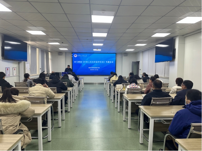 于1月19日下午在40202会议室召开《中华人民共和国学位法》宣贯会。学院党委书记代辉亚、党委副书记梁艳、教学副院长阎磊、学术副院长陈亮及全体教师参加会议。