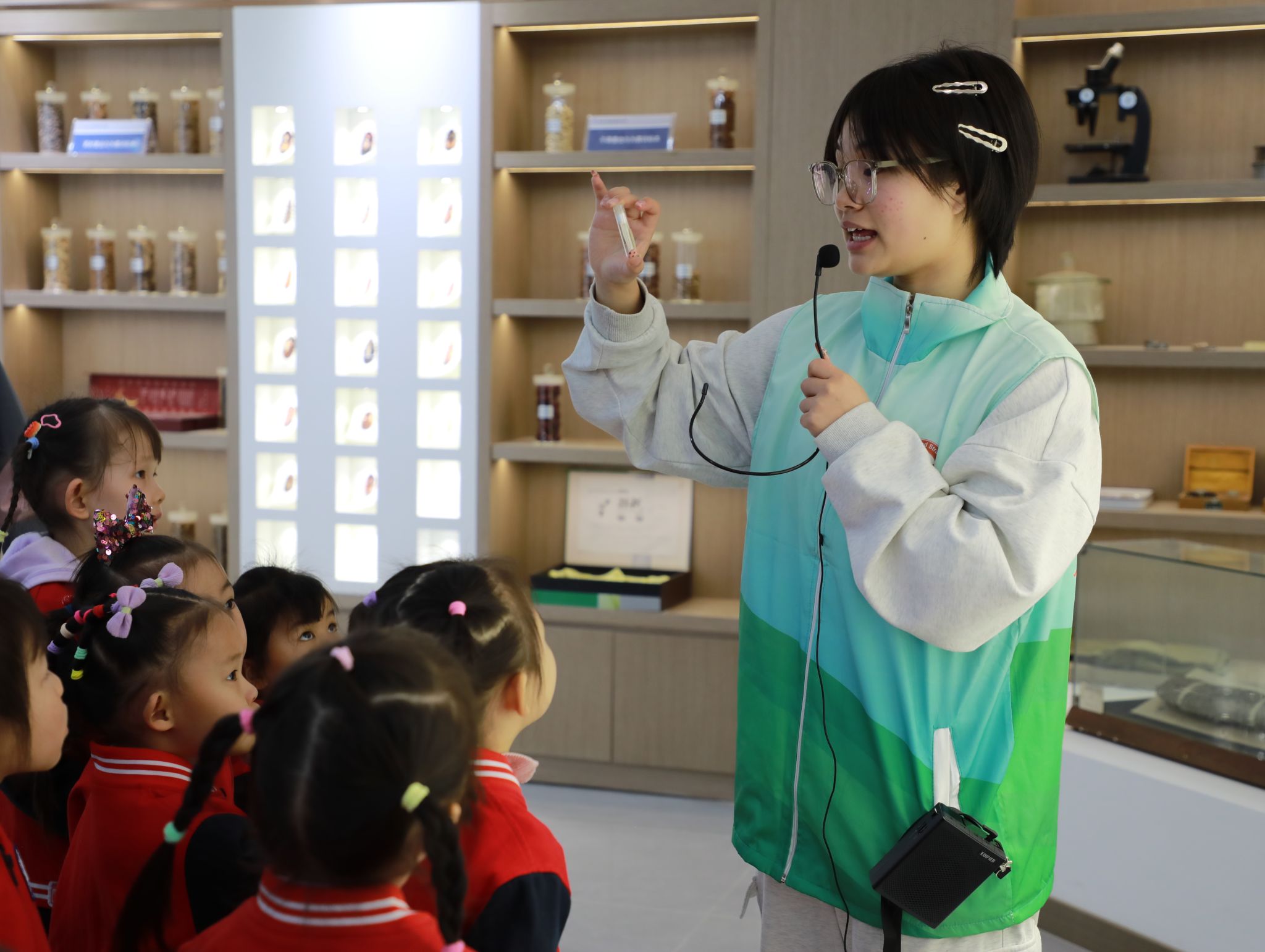 (宣讲员杨揆为小朋友们讲解标本)