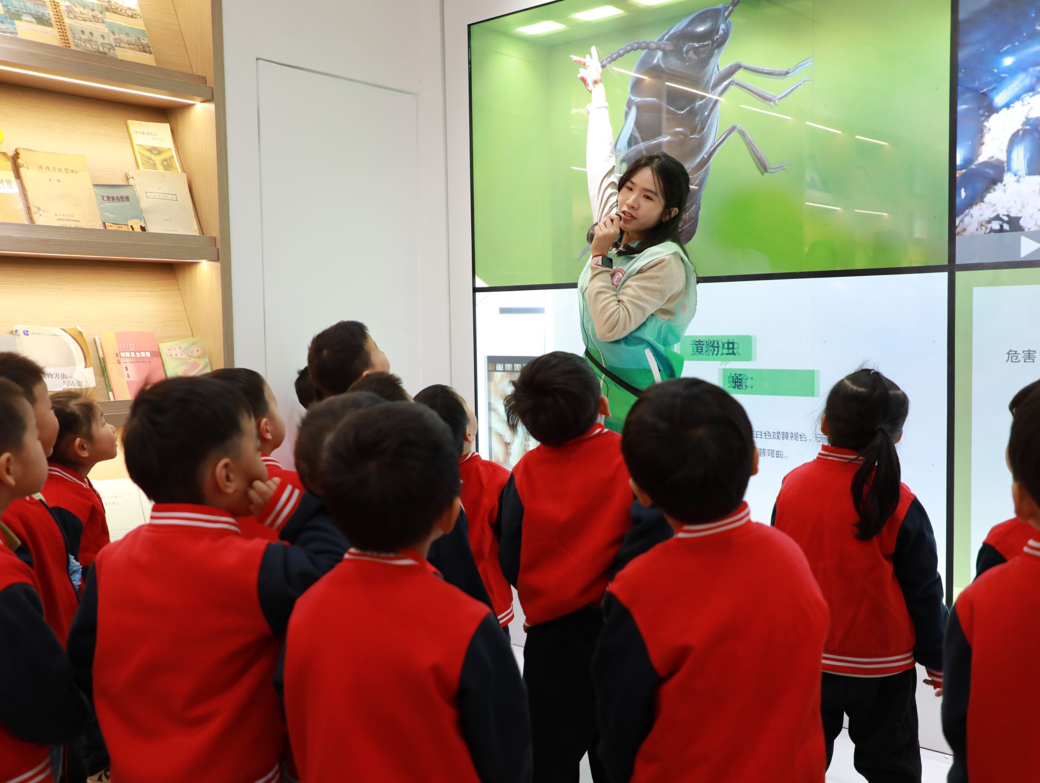 活动开始之前,梁艳和刘宇畅接待小朋友们按班级入馆,并向小朋友们讲述入馆安全注意事项。储藏物昆虫标本馆的讲解员们化身“昆虫导师”,向孩子们介绍米象、玉米象等常见储粮害虫的特征与防治知识。标本馆内置多台大屏幕多媒体,展示有中国储粮害虫分区、储粮昆虫的3D模型,以及多种昆虫的趣味科普小视频。小朋友们在参观中的各种疑问,讲解员都会以浅显易懂的语言一一解答。