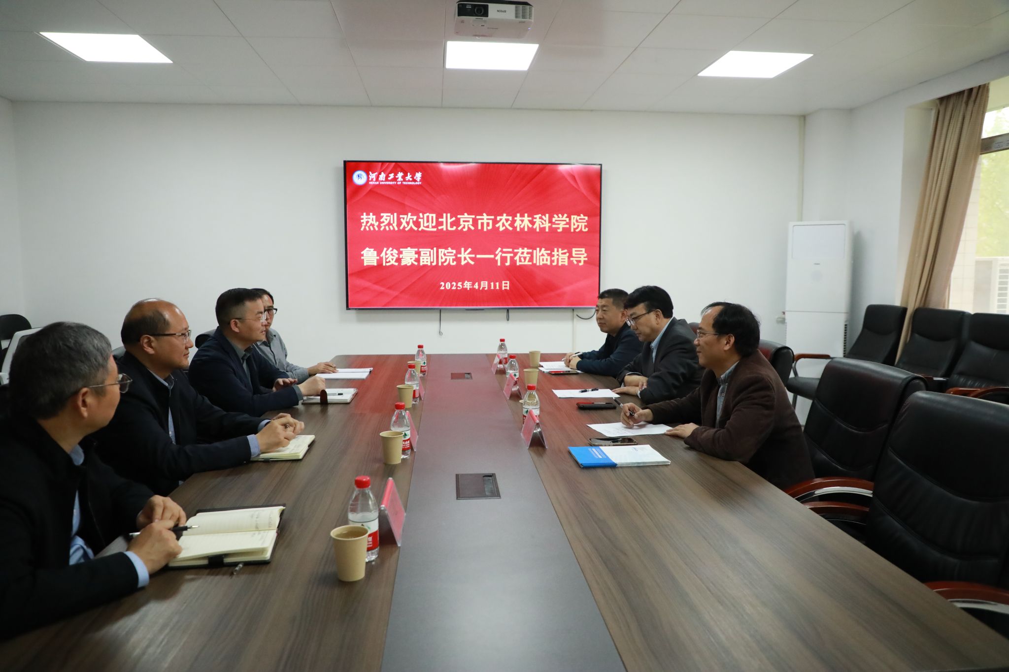 代辉亚对鲁俊豪一行来访表示热烈欢迎,并详细介绍了学院的发展历程、办学特色及对粮食行业的贡献。阎磊介绍了学院目前科研团队建设、学科发展方向以及对学校“双一流”学科建设的支撑作用。鲁俊豪介绍了北京市农林科学院的学科建设情况,希望未来双方在粮食与物资储备领域能够加强合作。双方团队成员对粮食与物资储备领域信息化方面的研究基础和合作方向进行了深入讨论,为后期加强科研合作理清了思路。
