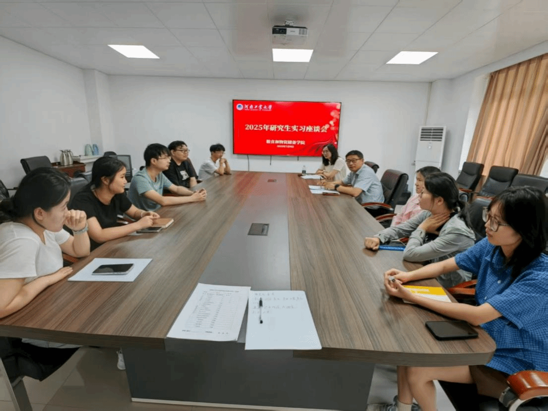 在40-212召开2025年研究生实习座谈会,会议由学术副院长陈亮主持,学科科研与办公室主任刘江、带队老师周丽贞及8名实习生参加。