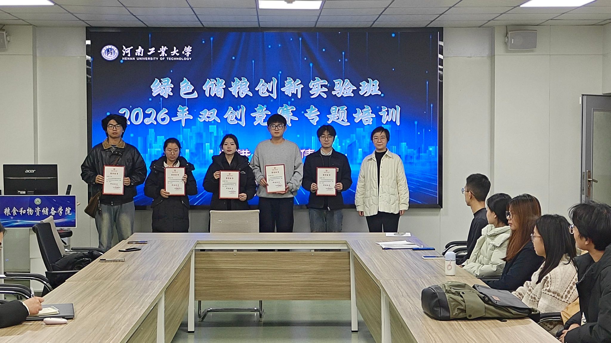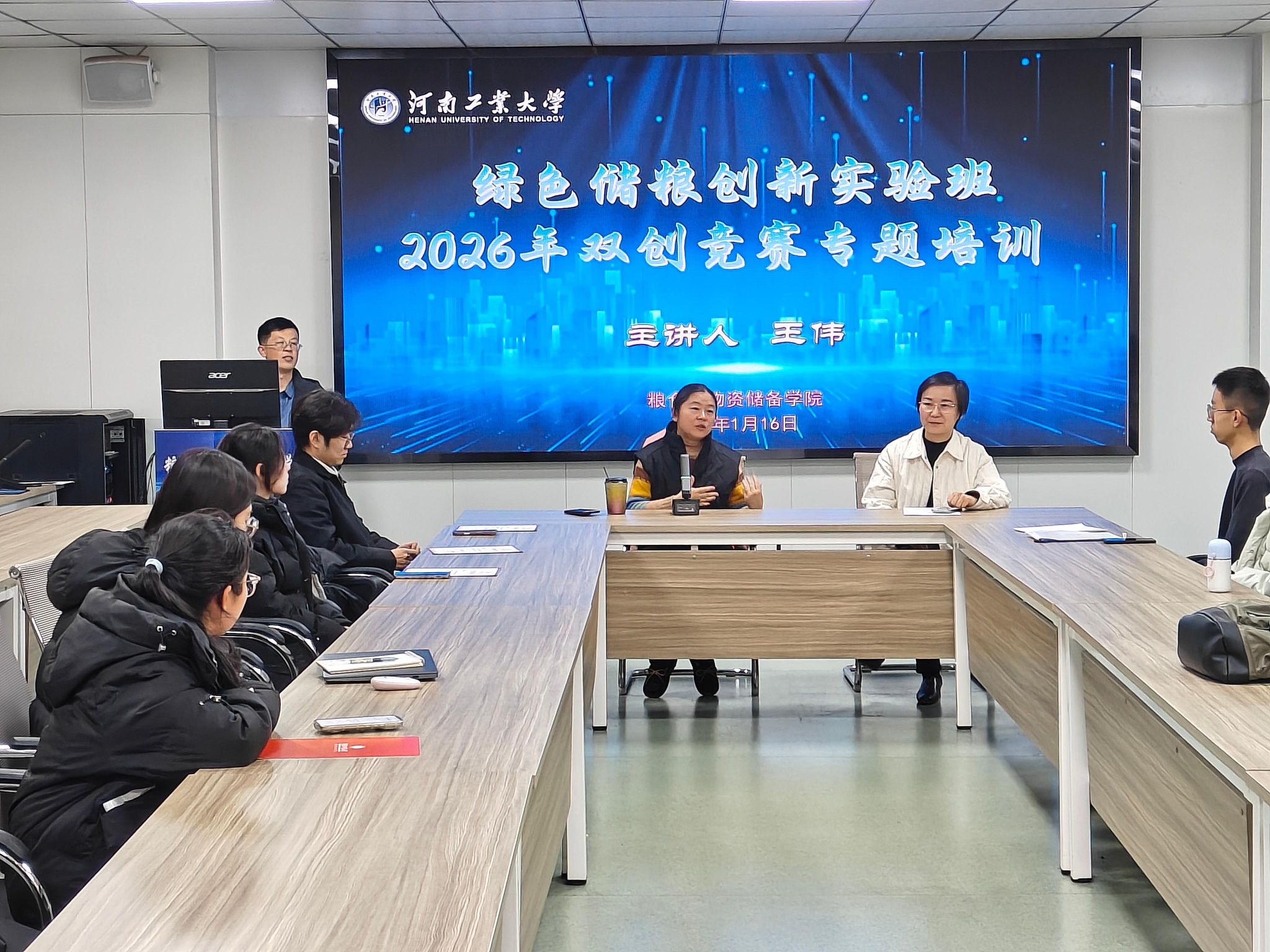 于崇实楼202捷赛厅举办2026年度绿色储粮创新实验班开班仪式暨双创赛事专题培训会。中国青年创业导师、管理学院王伟老师,院党委副书记梁艳及实验班全体学员参会,会议由学院团委副书记刘宇畅主持。